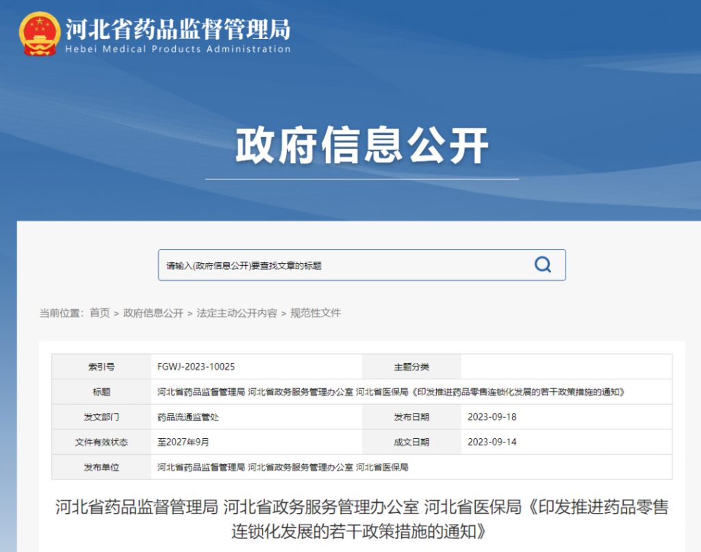 9月18日,河北省藥監局、河北省政務服務管理辦公室、河北省醫保局三個部門聯合發布《印發推進藥品零售連鎖化發展的若干政策措施的通知》(以下簡稱《通知》),河北省藥品零售連鎖行業發展將迎空前政策利好和巨變。