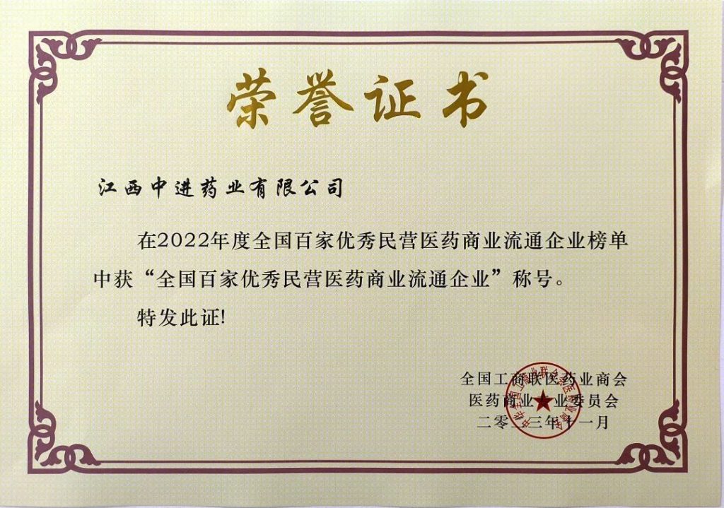 中進藥業榮獲全國工商聯醫藥業商會“全國百家優秀民營醫藥商業流通企業”稱號